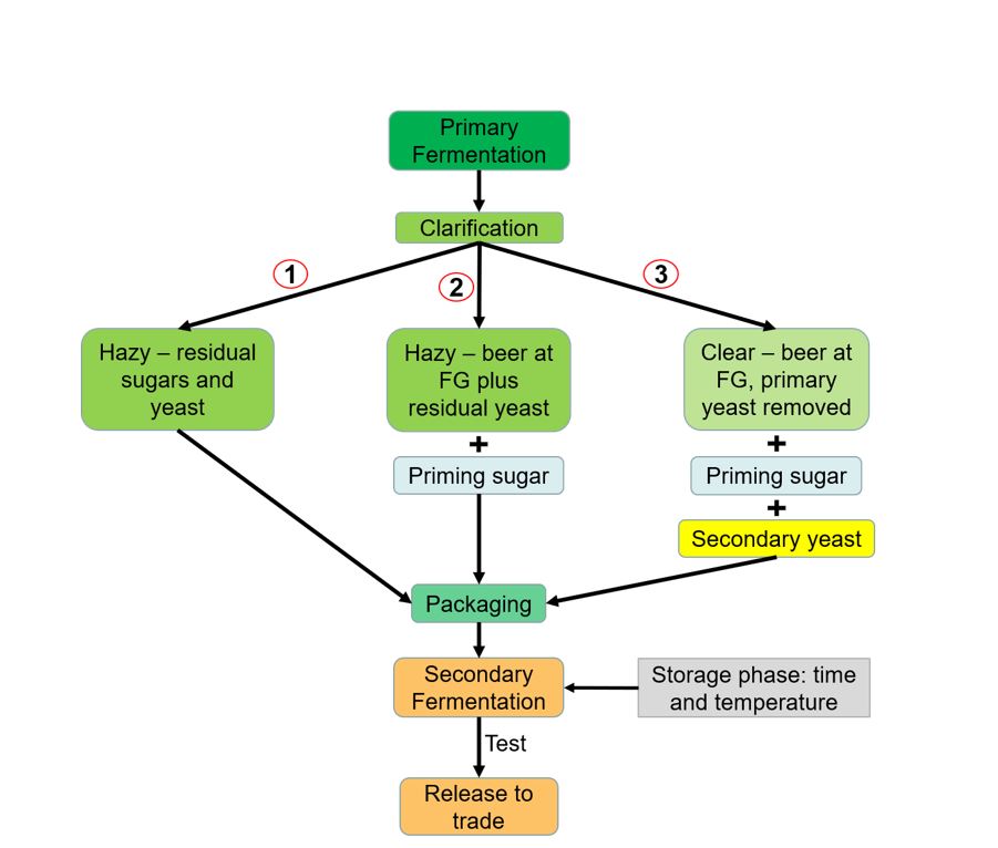 Alternatively, the beer may be clarified completely, and a defined yeast cell count added at bottling (see flowchart option 3).
