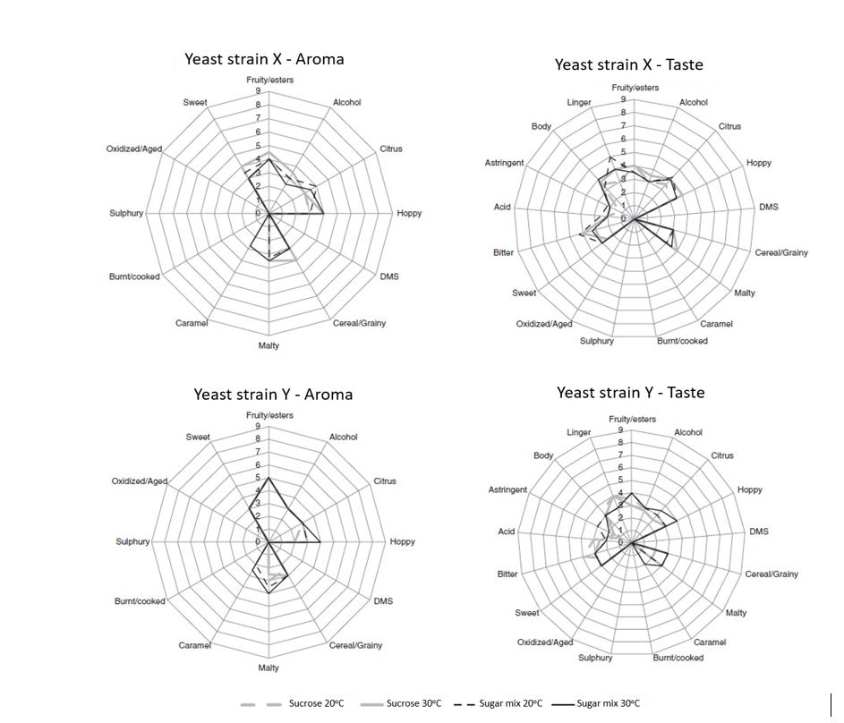 For example, yeast strain Y shows the highest score for fruity/estery aromas and yeast strain X shows the highest scores the citrus, cereal/grainy, malty, sweet aromas.
