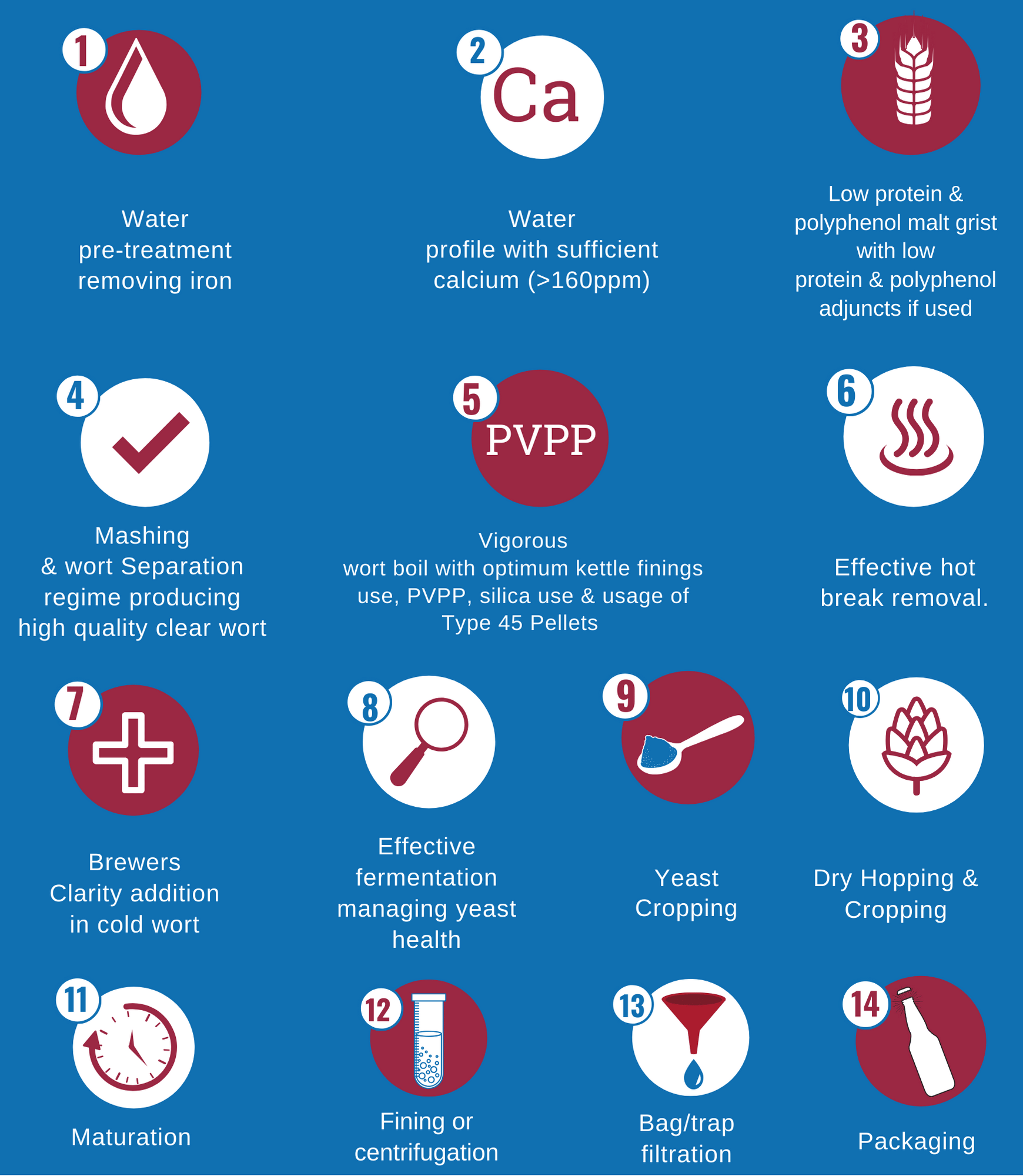 In this section, the focus will be on producing clear stable beer. If this is not the brewers intended goal, an understanding should still be useful in producing other clarity goals. Protein, polyphenol, polysaccharide and yeast are all common causes of haze in beer. Effective raw material selection, processing and treatments need to align to produce clarity and physical stability.
