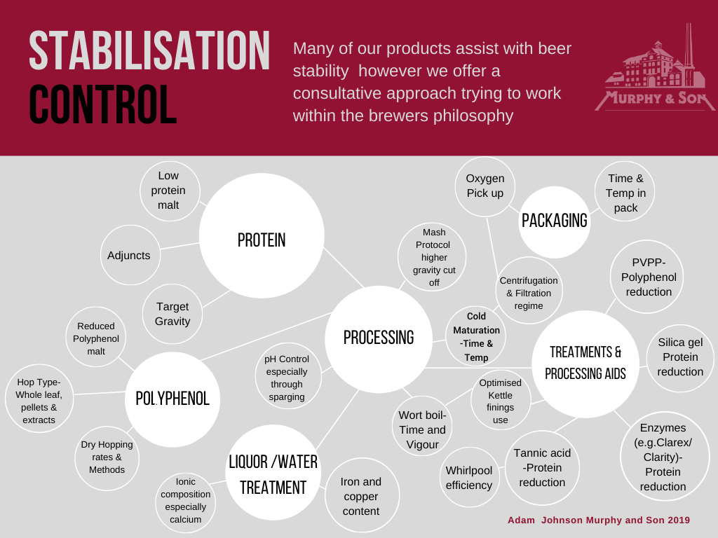 - The use of low protein and polyphenol adjuncts such as Sugar, Maize and Rice to dilute haze precursors.